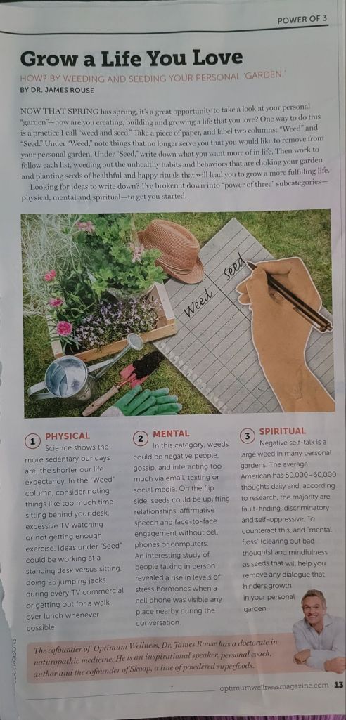 I was going through an old sketchbook I had used as a scrapbook of cards and other magazine clippings I had kept over the years. I came across this article I had taken from Optimum Wellness Magazine. It struck a chord with me because I have always enjoyed plants, and, quite honestly, I have had better success with indoor plants. Recently I have begun to explore planting outdoors and when I was reading this, it caused me to reflect on what my personal garden consists of.