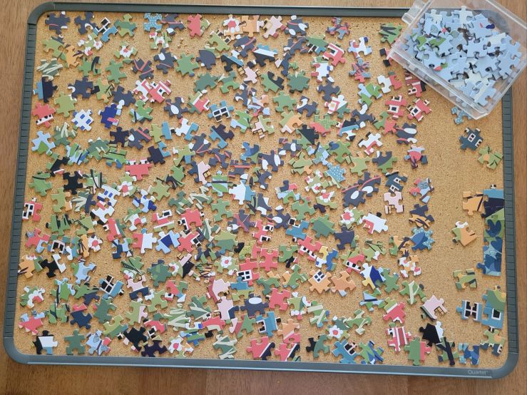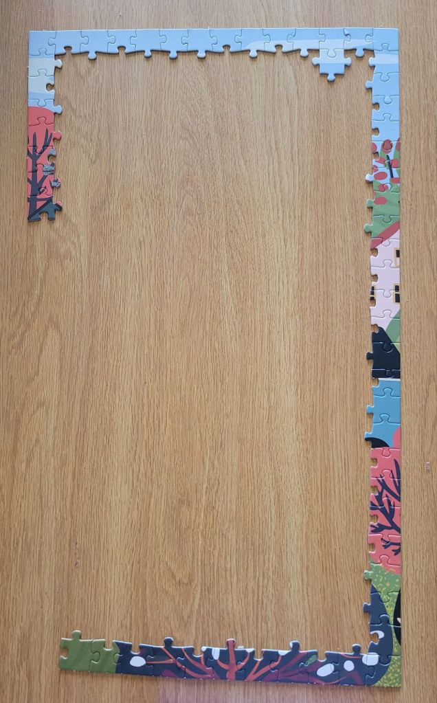 After he passed 3 years ago, I had no desire to look at a puzzle, much less do one. It was maybe a few months ago that I had picked up a few puzzles from the Dollar store, thinking maybe I would do them. I picked the smaller one of 100 pieces just to try it. I did it and saved it in the vault, but it wasn’t the same. It wasn’t until last night, after I had a bad day and was struggling physically from the after effects of a stressful situation earlier in the day, that I thought I should try to do another one and it’s a 350-piece puzzle. As I was gathering the border pieces, I got to a point where I hit a wall. Something wasn’t looking right in one section of the border, and I had used all the border pieces I could find with the same design. I was searching through all the pieces, thinking maybe I was overlooking some. I was getting more and more frustrated, hoping that I didn’t lose a piece somehow.