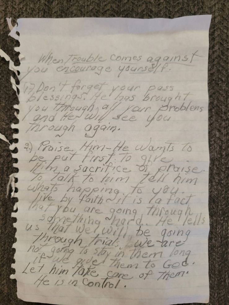 Through the years, I knew my mom liked to write notes while attending Bible study, Church sermons, and watching her favorite preachers on TV. I saved the ones I would come across and put them in some storage bins because I knew I wanted to keep them. After she passed in September 2023, I came across more writings on index cards or just random pieces of paper while going through her belongings. Just yesterday, I was cleaning my office space, moved my desk, and noticed that a small piece of paper had fallen behind it. I picked it up, and it was one of my mom’s writings. It took my breath away because the heading at the top stated, “When trouble comes against you, encourage yourself.”